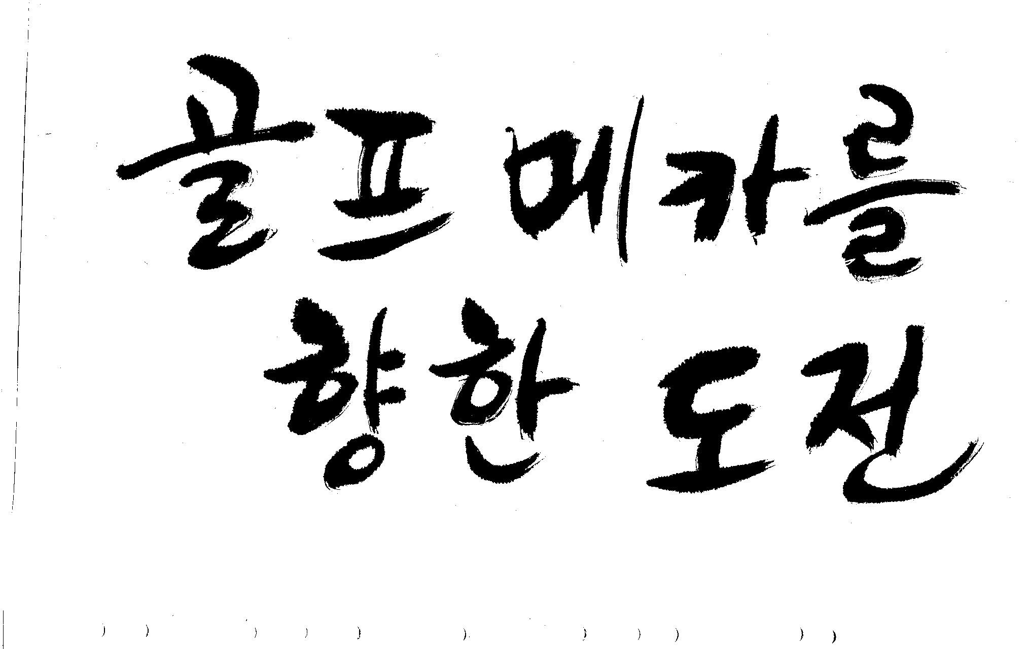 우경의 행복한 캘리세상-골프메카 김철호 일반 0 8743 2009.07.18 10:25 리듬감을 최대한 살리고 ㅡ 스포츠의 운동감과 밝음 기교섞인 획을 배제--일반적인 느낌 굵기변화를 통하여 도전 낱말을 강조 스타일은 비슷하지만 ...한 사람이 썼으니까 ㅎㅎㅎ 서로 다른 글꼴을 올린 것은... 비교하여 보시고... 편집자에게 선택권을 주는 것입니다